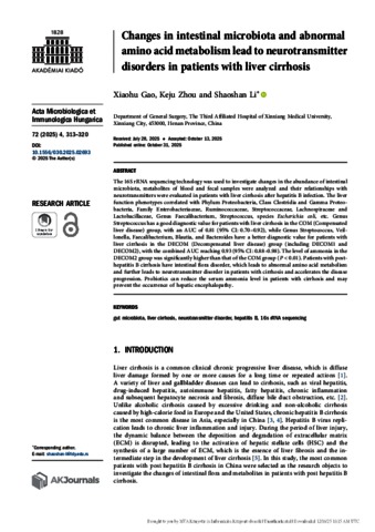 Gao, Xiaohu and Zhou, Keju and Li, Shaoshan (2025) Changes in intestinal microbiota and abnormal amino acid metabolism lead to neurotransmitter disorders in patients with liver cirrhosis. ACTA MICROBIOLOGICA ET IMMUNOLOGICA HUNGARICA, 72 (4). pp. 313-320. ISSN 1217-8950