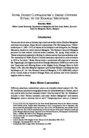 the present article aims at introducing a ritual text written by the Khalkha Mongolian saint and reincarnation, shiwa shireet luwsanshiwa (tib. Blo bzang zhi ba, “nobleminded piece”, 1682‒1745) in honour of his birthplace and living area, the Khangai Mountains situated in central-western Mongolia.1 the national library of Mongolia preserves his two-volume collected works (sümbüm, tib. gsung ‘bum) written in tibetan and printed originally in Beijing. it contains mostly ritual and meditative texts. the community of shiwa shireet’s revived monastery reprinted his collected works in 2023 as facsimile.2 Shiwa Shireet wrote a purification offering text to venerate Mt. otgontenger, the highest peak of the Khangai Mountains (4008 m) as well as the text “Invocation and Offering Prayer to the Mighty Deity, Khangai Khan to Fulfil hopes” (tib. Lha chen Hang ka’i rgyal po’i gsol mchod ’dod pa’i re bskong zhes bya ba bzhugs so, ff. 12r−16v, National Library of Mongolia, S: NL10680-068), subject of the current study to venerate Khangai Khan, the spiritual lord of the mountain together with his retinue.