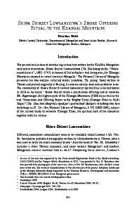 Teleki, Krisztina (2025) Shiwa Shireet Luwsanshiwa's Smoke Offering Ritual to the Khangai Mountains. In: Aspects of mongolian buddhism 4: Animals, Plants, Nature and Bioethics in Mongolian Buddhism. L'Harmattan, Budapest, pp. 191-212. ISBN 9782336535425