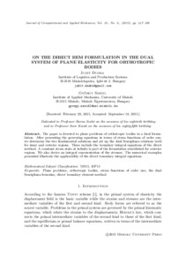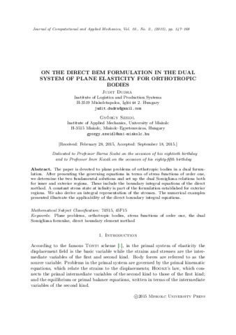 Dudra, Judit and Szeidl, György (2015) On the direct BEM formulation in the dual system of plane elasticity for orthotropic bodies. JOURNAL OF COMPUTATIONAL AND APPLIED MECHANICS, 10 (2). pp. 147-168. ISSN 1586-2070