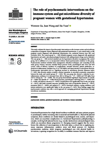 Gu, Wenwen and Wang, Juan and Yuan, Xia (2025) The role of psychosomatic interventions on the immune system and gut microbiome diversity of pregnant women with gestational hypertension. ACTA MICROBIOLOGICA ET IMMUNOLOGICA HUNGARICA, 72 (4). pp. 321-330. ISSN 1217-8950