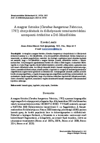 A vizsgálat a magyar futrinka (Carabus hungaricus) elterjedésének és élőhelyeinek értékelését mutatja be a Dél-Mezőföldön. A faj dél-mezőföldi előfordulását illetően hiányosak az ismereteink, az adatok megerősítésre szorultak. Az élvefogó csapdázással nyert abundanciaadatok azt mutatták, hogy a Dél-Mezőföld a magyar futrinka jelentős előfordulási területe a Kárpát-medencében. A faj kimagasló egyedszámmal fordult elő a bikácsi Ökör-hegyen. A németkéri Hardi-legelőn és a vajtai Nagy-legelőn először tudtuk kimutatni a jelenlétét, eddig ezeken a gyepeken nem volt ismert előfordulási adata. Az élőhelyi tényezők közül a homoki sztyepprétek természetessége, illetve a zsombékoló füvek aránya jelentős pozitív, a legeltetés és a vegetáció-borítottság növekedése szignifikánsan negatív hatást gyakorolt az abundanciára. A kriptogámok (zuzmók, mohák) jelenléte kisebb, de még szignifikáns, a vegetáció magassága nem szignifikáns pozitív kapcsolatot mutatott. Az eredmények alapján megállapítható, hogy a faj védelme érdekében legeltetésből időszakosan kizárt, illetve extenzíven legeltetett, természetes vegetációszerkezetű homoki sztyepprét élőhelymozaikok kijelölése szükséges. | The study presents the distribution and habitat selection of Carabus hungaricus in the Dél-Mezőföld region of Hungary, in order to fill in the gaps in our knowledge about the species' presence in the region. The abundance of C. hungaricus collected by pitfall trapping in the area showed that the Dél-Mezőföld is an important site for the species. A high number of individuals was recorded at the Ökör-hegy in Bikács. The presence of the species was also shown on two locations where it had previously not been observed, on the Hardi-legelő in Németkér and on the Nagy-legelő in Vajta. From the habitat factors, the naturalness of the sandy steppe vegetation and the proportion of tussock-forming grasses had a significant positive effect, while grazing and vegetation cover had a significant negative effect on the abundance of the species. The presence of cryptogams (lichens, mosses) had a slightly significant, positive effect, while vegetation height showed a non-significant positive correlation with the abundance of the species. Based on the results, we recommend the designation of habitat mosaics with appropriate vegetation structure where grazing is periodically excluded or extensively managed, for the more effective protection of the species.