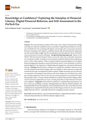 Módosné Szalai, Szilvia and Jenei, Szonja and Németh, Erzsébet (2025) Knowledge or Confidence? Exploring the Interplay of Financial Literacy, Digital Financial Behavior, and Self-Assessment in the FinTech Era. FINTECH, 4 (4). No. 75. ISSN 2674-1032