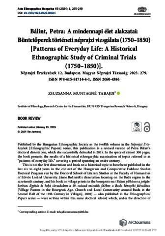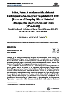 Muntagné Tabajdi, Zsuzsanna (2024) Bálint, Petra: A mindennapi élet alakzatai: Büntetőperek történeti néprajzi vizsgálata [Patterns of Everyday Life: A Historical Ethnographic Study of Criminal Trials (1750–1850)]. ACTA ETHNOGRAPHICA HUNGARICA, 69 (1). pp. 245-249. ISSN 1216-9803