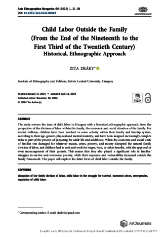 Deáky, Zita (2024) Child Labor Outside the Family (From the End of the Nineteenth to the First Third of the Twentieth Century). ACTA ETHNOGRAPHICA HUNGARICA, 69 (1). pp. 21-38. ISSN 1216-9803