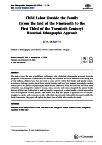 The study reviews the issue of child labor in Hungary with a historical, ethnographic approach, from the perspective of the division of labor within the family, the economic and social situation of the family. For several millenia, children have been involved in some activity within their family and kinship system, according to their age, gender, physical and mental maturity, and have been assigned increasingly complex tasks as part of the process of preparing for adult life and adulthood. When the economic and social unity of families was damaged for whatever reason, crises, poverty, and misery disrupted the natural family division of labor, and children had to seek and work for wages, food, or other benefits, with the approval or even encouragement of their parents. This means that they also played a significant role in families' struggles to survive and overcome poverty, while their exposure and vulnerability increased outside the family framework. The paper will explore the latter form of child labor outside the family.