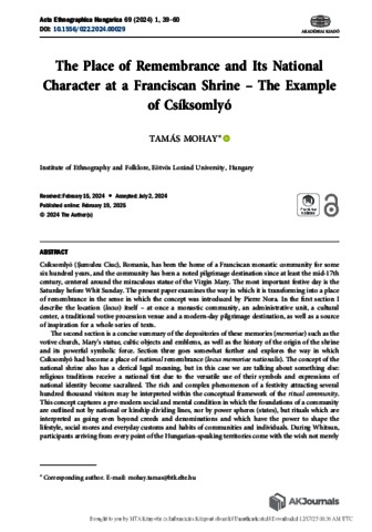Mohay, Tamás (2024) The Place of Remembrance and Its National Character at a Franciscan Shrine – The Example of Csíksomlyó. ACTA ETHNOGRAPHICA HUNGARICA, 69 (1). pp. 39-60. ISSN 1216-9803