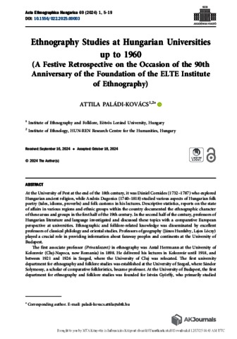 Paládi-Kovács, Attila (2025) Ethnography Studies at Hungarian Universities up to 1960 : (A Festive Retrospective on the Occasion of the 90th Anniversary of the Foundation of the ELTE Institute of Ethnography). ACTA ETHNOGRAPHICA HUNGARICA, 69 (1). pp. 5-19. ISSN 1216-9803