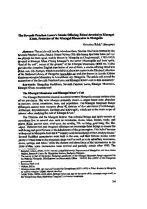 The article will briefly introduce three Tibetan ritual text~ writicn by the Seventh Panchen Lama, Palden Tenpai Nyirna (Tib. Bio bzang dpal ldan bstan pa'i nyi ma phyogs las mam rgyal, widely known in Mongolia as Chogloinamjil, 1782- 1853) devoted to Khangai Khan ("King Khangai"), the minor Dhamrnpala and local spirit, • tord of the soil", owner of the ground" of the Khangai Mountains (4008 m). It also p-ovides the complete English translation of one of them, a smoke-offering ritual text (Kha!. san, Tib. bsa11gs), which is available in about ten copies in lhe Tibetan Collection of the National Library of Mongolia (www.bdrc.jo) and also known in Arvain Kh(iree Gandanpuntsoglin Monastery in Arwaikheer city, Mongolia. The a1ticle will reveal the connection of the Seventh Panchen Lama and Khangai Khan's cult in this monastery.