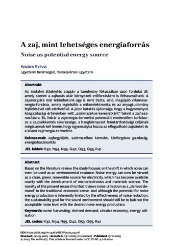 Az irodalmi áttekintés alapján a tanulmány fókuszában azon fordulat áll, amely szerint a zajhatás akár környezeti erőforrásként is felhasználható. A zajenergiára már tekinthetünk úgy is mint tiszta, zöld, megújuló villamosenergia-forrásra, amely leginkább a mikroelektronika és az anyagtudomány fejlődésével vált elérhetővé. A jelen kutatás újdonsága, hogy a hagyományos közgazdasági értelemben vett „származékos keresletként” tekint a zajhasznosításra. És, habár a zajenergia-termelési potenciált eredendően korlátozza a zajcsökkentés sikeressége, a hangkörnyezet fenntarthatósági céljának mégis annak kell lennie, hogy egyensúlyba hozza az elfogadható zajszintet és a kívánt zajenergia-termelést. | Based on the literature review, the study focuses on the shift in which noise can even be used as an environmental resource. Noise energy can now be viewed as a clean, green, renewable source for electricity, which has become available mainly with the development of microelectronics and materials science. The novelty of the present research is that it views noise utilisation as a „derived demand” in the traditional economic sense. And although the potential for noise energy production is inherently limited by the effectiveness of noise reduction, the sustainability goal for the sound environment should still be to balance the acceptable noise level with the desired noise energy production.