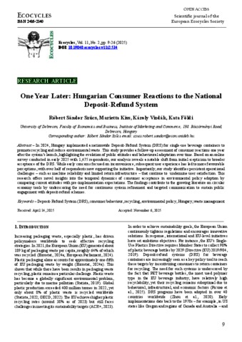 Szűcs, Róbert Sándor and Kiss, Marietta and Vizdák, Károly and Földi, Kata (2025) One Year Later: Hungarian Consumer Reactions to the National Deposit-Refund System. ECOCYCLES, 11 (2). pp. 9-26. ISSN 2416-2140