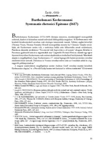 Restás, Attila (2011) Bartholomaei Keckermanni Systematis rhetorici Epitome (1617). In: Eruditio, virtus et constantia: Tanulmányok a 70 éves Bitskey István tiszteletére. Debreceni Egyetemi Kiadó, Debrecen, pp. 55-60. ISBN 9789633181065