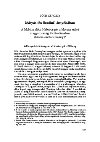 Tóth, Gergely (2025) Mátyás (és Bonfini) árnyékában: A Mohács előtti Habsburgok a Mohács utáni magyarországi történetírásban (három esettanulmány). In: Mítoszok és értelmezések: tanulmányok a középkori magyar uralkodók megítéléséről. Magyar Történelmi Emlékek: Értekezések . ELTE HTK Történettudományi Intézet, Budapest, pp. 129-154.