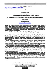 Ez a cikk ismertető "A kételkedés méltósága" című, Majsai Tamás 70. születésnapjára kiadott tanulmánykötetről. A szerző méltatja azokat az erőfeszítéseket, amelyek egy lelkészképző főiskolából tudományos műhelyt igyekeztek fejleszteni, hangsúlyozva a könyvkiadás fontosságát ebben a folyamatban. A recenzió rávilágít a kötet két domináns témájára: a Soá (holokauszt) feldolgozása, valamint a társadalom változásainak sokszínű vetületei a teológiában és az oktatáskutatásban. A szerző összegzésképp az ünneplés és a közösség erejét hangsúlyozza, és gratulál Majsai Tamásnak az általa teremtett értékekért és a körötte lévő szeretetteljes közösségért. | This article is a review of the volume "The Dignity of Doubt", a collection of studies published in honour of Tamás Majsai on his 70th birthday. The author pays tribute to the efforts to develop a scholarly workshop from a theological college. The review sheds light on the volume's two dominant themes: the examination of the Shoah (Holocaust) and the diverse aspects of social change, ranging from theology to educational research. In conclusion, the author congratulates Tamás Majsai for the values he has created and the loving community surrounding him.