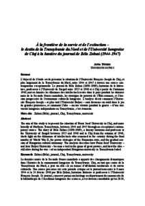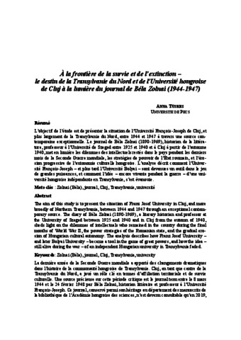 L’objectif de l’étude est de présenter la situation de l’Université François-Joseph de Cluj, et plus largement de la Transylvanie du Nord, entre 1944 et 1947 à travers une source contemporaine exceptionnelle. Le journal de Béla Zolnai (1890-1969), historien de la littérature, professeur à l’Université de Szeged entre 1925 et 1940 et à Cluj à partir de l’automne 1940, met en lumière les dilemmes des intellectuels restés dans le pays pendant les derniers mois de la Seconde Guerre mondiale, les stratégies de pouvoir de l’État roumain, et l’érosion progressive de l’autonomie culturelle hongroise. L’analyse décrit comment l’Université François-Joseph – et plus tard l’Université Bolyai – sont devenues un outil dans le jeu de grandes puissances, et comment l’idée – encore vivante pendant la guerre – d’une université hongroise indépendante en Transylvanie, s’est évanouie.
