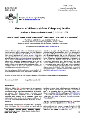 Gyulai, Gábor Zs. and Malone, Renée P. and Gyulai, Gábor and Murenetz, Lilla and Szőke, Antal and Tóth-Lencsés, K.A. (2025) Genetics of oil beetles (Meloe, Coleoptera) in silico : A tribute to Schrank von Paula [1747–1835], 1776. ECOCYCLES, 11 (2). pp. 35-42. ISSN 2416-2140