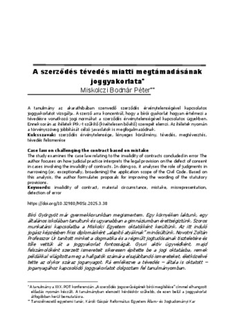 Miskolczi Bodnár, Péter (2025) A szerződés tévedés miatti megtámadásának joggyakorlata = Case law on challenging the contract based on mistake. MISKOLCI JOGI SZEMLE: A MISKOLCI EGYETEM ÁLLAM- ÉS JOGTUDOMÁNYI KARÁNAK FOLYÓIRATA, 20 (3). pp. 38-52. ISSN 1788-0386