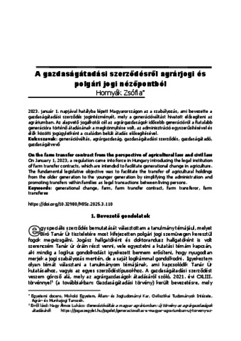 Hornyák, Zsófia (2025) A gazdaságátadási szerződésről agrárjogi és polgári jogi nézőpontból = On the farm transfer contract from the perspective of agricultural law and civil law. MISKOLCI JOGI SZEMLE: A MISKOLCI EGYETEM ÁLLAM- ÉS JOGTUDOMÁNYI KARÁNAK FOLYÓIRATA, 20 (3). pp. 110-121. ISSN 1788-0386