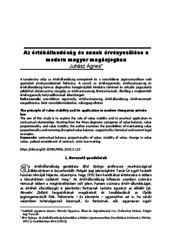 A tanulmány célja az értékállandóság szerepének és a szerződéses jogviszonyokban való gyakorlati érvényesülésének feltárása. A szerző az értékegyensúly, értékarányosság és értékállandóság hármas dogmatikai kategóriájából kiindulva történeti és aktuális jogszabályi példákkal alátámasztva vizsgálja az értékarányosság fenntartásának, illetőleg a megbomlott értékegyensúly helyreállításának lehetőségeit. | The aim of this study is to explore the role of value stability and its practical application in contractual relationships. Starting from the three dogmatic categories of value balance, value proportionality, and value stability, the author examines the possibilities of maintaining value proportionality and restoring disrupted value balance, supported by historical and current legal examples.