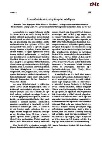 Nagy, Kornél (2016) Az erzsébetvárosi örmény könyvtár katalógusa : Armenuhi Drost-Abgarjan – Bálint Kovács – Tibor Márti: Catalogue of the Armenian Library in Elisabethopolis. Leipzig–Eger 2011. (Armenian Cultural Heritage in the Carpathian Basin, 1.) 408 old. ERDÉLYI MÚZEUM, 78 (1). pp. 139-140. ISSN 1453-0961