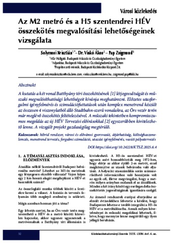 Solymosi, Krisztián and Vinkó, Ákos and Pap, Zsigmond (2025) Az M2 metró és a H5 szentendrei HÉV összekötés megvalósítási lehetőségeinek vizsgálata = Feasibility study on the interconnection of metro line M2 and suburban railway line H5 in Budapest. KÖZLEKEDÉSTUDOMÁNYI SZEMLE, 75 (6). pp. 32-43. ISSN 0023-4362