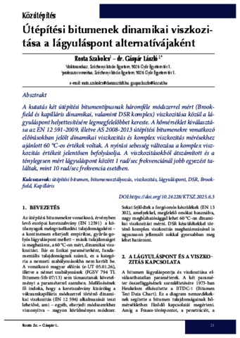 A kutatás két útépítési bitumentípusnak háromféle módszerrel mért (Brookfield és kapilláris dinamikai, valamint DSR komplex) viszkozitása közül a lágyuláspont helyettesítésére legmegfelelőbbet kereste. A hőmérséklet kiválasztása az EN 12 591-2009, illetve AS 2008-2013 útépítési bitumenekre vonatkozó előírásokban jelölt dinamikai viszkozitás és komplex viszkozitás mérésekhez ajánlott 60 °C-os értékek voltak. A nyírási sebesség változása a komplex viszkozitás értékeit jelentősen befolyásolja. A viszkozitásokból átszámított és a ténylegesen mért lágyuláspont között 1 rad/sec frekvenciánál jobb egyezést találtak, mint 10 rad/sec frekvencia esetében. | The research sought to find the most suitable replacement for softening point among the viscosities of two types of road construction bitumen measured using three methods (Brookfield and capillary dynamic, and DSR complex). The temperature was selected based on the values recommended for dynamic viscosity and complex viscosity measurements in the EN 12 591-2009 and AS 2008-2013 specifications for road construction bitumen, which was 60 °C. Changes in shear rate significantly affect complex viscosity values. A better correlation was found between the softening point converted from the viscosities measured and the actual measured softening point at a frequency of 1 rad/sec than at a frequency of 10 rad/sec.