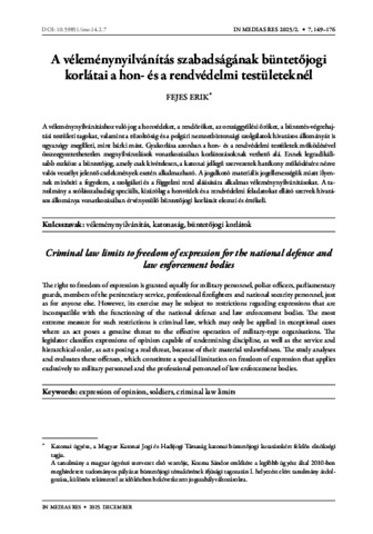 Fejes, Erik (2025) A véleménynyilvánítás szabadságának büntetőjogi korlátai a hon- és a rendvédelmi testületeknél. IN MEDIAS RES: FOLYÓIRAT A SAJTÓSZABADSÁGRÓL ÉS A MÉDIASZABÁLYOZÁSRÓL, 14. pp. 149-176. ISSN 2063-6253