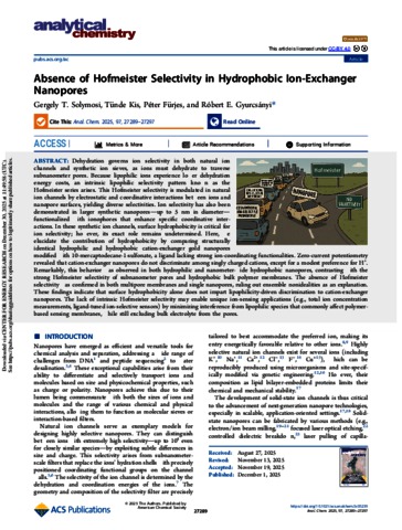 Solymosi, Gergely T. and Kis, Tunde and Fürjes, Péter and Gyurcsanyi, Robert E. (2025) Absence of Hofmeister Selectivity in Hydrophobic Ion-Exchanger Nanopores. ANALYTICAL CHEMISTRY, 97 (49). pp. 27289-27297. ISSN 0003-2700