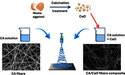 New eco-friendly fiber composites were developed by electrospinning cellulose acetate (CA) combined with calcium oxide (CaO) derived from thermally treated waste eggshells. CA solutions were prepared at varying concentrations to optimize the ideal concentration for producing smooth, continuous, and beads-free fibers. Various amounts of CaO were then added to assess its impact on fiber structure, crystallinity, and swelling characteristics. FTIR examinations demonstrated that CaO was effectively integrated without altering the CA structure, however XRD investigations revealed reduction in crystallinity with increasing CaO content. The swelling capacity remarkedly increased to 710% at 4% CaO, attributed to enhanced porosity and hydrophilicity, before showing a slight decline at higher concentrations due to particle aggregation. These results highlight a sustainable method for producing functional CA/CaO composites with tailored properties for promising applications in biomedical and environmental fields. Our further aim is to study the biocompatibility, cytotoxicity and the photocatalytic activity of the prepared composites.