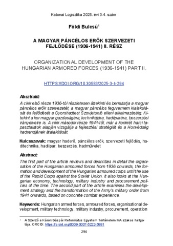 Földi, Bulcsú (2025) A magyar páncélos erők szervezeti fejlődése (1936-1941) II. rész = Organizational Development of the Hungarian Armored Forces (1936-1941) Part II. KATONAI LOGISZTIKA, 33 (3-4). pp. 294-310. ISSN 1588-4228 (nyomtatott); 1789-6398 (online)