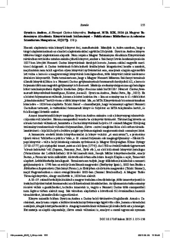 Monok, István (2025) Gyuricza Andrea, A Nemzeti Casino könyvtára, Budapest, MTA KIK, 2024 (A Magyar Tudományos Akadémia Könyvtárának közleményei – Publicationes Bibliothecae Academiae Scientiarum Hungaricae, 52(127)). MAGYAR KÖNYVSZEMLE, 141 (1). pp. 155-156. ISSN 0025-0171