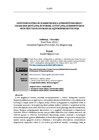 Frank, Tamás (2025) Oktatáspolitika és szakértelem a székesfővárosban? Zilahi Kiss Jenő (1921) és Purebl Győző (1926) székesfőváros oktatási tanácsnokainak sajtóreprezentációja = Education policy and expertise in the capital city: press representations of Jenő Zilahi-Kiss (1921) and Győző Purebl (1926), educational commissioners of Budapest. OXIPO : INTERDISZCIPLINÁRIS E-FOLYÓIRAT, 7 (4). pp. 63-79. ISSN 2676-8771