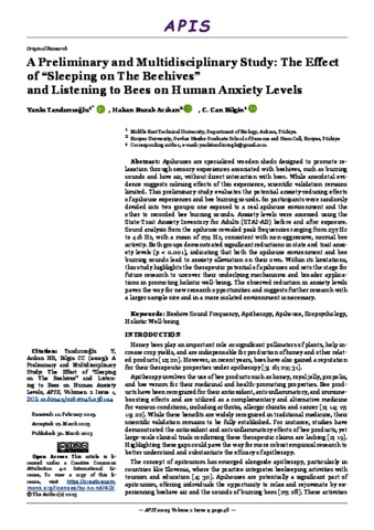 Tandırcıoğlu, Yankı and Acıkan, Hakan Burak and Bilgin, C. Can (2025) A Preliminary and Multidisciplinary Study: The Effect of “Sleeping on The Beehives” and Listening to Bees on Human Anxiety Levels. APIS, 2 (1). pp. 48-53. ISSN 3058-0382