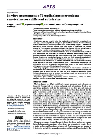 Gill, Maggie C. and Chuttong, Bajaree and Davies, Paul and Earl, Avril and Tonge, George and Etheridge, Dan (2025) In vitro assessment of Tropilaelaps mercedesae survival across different substrates. APIS, 2 (2). pp. 22-27. ISSN 3058-0382