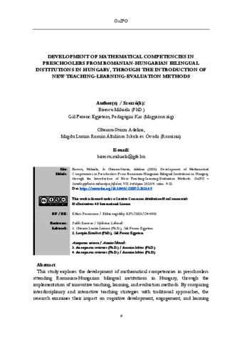 Birescu, Mihaéla and Olteanu-Sturza, Adelina (2025) Development of Mathematical Competencies in Preschoolers From Romanian-Hungarian Bilingual Institutions in Hungary, through the Introduction of New Teaching-Learning-Evaluation Methods = A matematikai kompetenciák fejlesztése magyarországi román–magyar kétnyelvű intézmények óvodáskorú gyermekei körében új tanítási–tanulási–értékelési módszerek bevezetésével. OXIPO : INTERDISZCIPLINÁRIS E-FOLYÓIRAT, 7 (4). pp. 9-22. ISSN 2676-8771