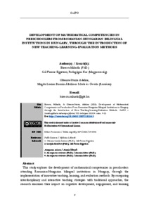 This study explores the development of mathematical competencies in preschoolers attending Romanian-Hungarian bilingual institutions in Hungary, through the implementation of innovative teaching, learning, and evaluation methods. By comparing interdisciplinary and interactive teaching strategies with traditional approaches, the research examines their impact on cognitive development, engagement, and learning outcomes. The study involved two groups of 51 preschoolers each, selected from four bilingual kindergartens. The experimental group participated in interdisciplinary activities integrating mathematics with language, art, and environmental studies. Using an experimental design, the study compares the effectiveness of interdisciplinary, interactive teaching methods with traditional, monodisciplinary ones. Two groups of preschoolers were observed over two months in bilingual institutions. Quantitative and qualitative data were collected through evaluations and teacher observations. Results showed that the experimental group exhibited significantly higher academic performance, attention span,and engagement. Activities combining mathematics with storytelling, arts, and physical movement proved particularly effective. Visual tools and structured methods, like Venn diagrams and the Cube method, supported understanding and retention. Traditionalmethods, while consistent, lacked the same level of engagement. Interdisciplinary strategies helped close gaps between children with varying initial abilities. Findings support the need for a play-based, integrative pedagogical approach. The study highlightsthe transformative potential of modern teaching in early mathematics. Implications are significant for curriculum design and early childhood policy. | A tanulmány a magyarországi román–magyar kétnyelvű intézményekbe járó óvodáskorú gyermekek matematikai kompetenciáinak fejlődését vizsgálja innovatív tanítási, tanulási és értékelési módszerek alkalmazásán keresztül. Az interdiszciplináris és interaktív pedagógiai stratégiák hagyományos módszerekkel történő összevetésével a kutatás azok kognitív fejlődésre, tanulói bevonódásra és tanulási eredményekre gyakorolt hatását elemzi. A vizsgálatban két, egyenként 51 főből álló óvodáscsoport vett részt, amelyeket négy kétnyelvű óvodából választottak ki. A kísérleti csoport interdiszciplináris tevékenységekben vett részt, amelyek a matematikát a nyelvi neveléssel, a művészeti tevékenységekkel és a környezeti neveléssel integrálták. A kísérleti kutatási elrendezés lehetővé tette az interdiszciplináris, interaktív oktatási módszerek és a hagyományos, monodiszciplináris megközelítések hatékonyságának összehasonlítását. A két óvodáscsoportot kéthónapos időtartam alatt figyelték meg kétnyelvű intézményekben. A kvantitatív és kvalitatív adatgyűjtés értékelések és pedagógusi megfigyelések útján történt. Az eredmények azt mutatták, hogy a kísérleti csoport szignifikánsan magasabb tanulmányi teljesítményt, hosszabb figyelmi időt és nagyobb bevonódást mutatott. Különösen hatékonynak bizonyultak a matematikát meséléssel, művészeti tevékenységekkel és mozgásos elemekkel ötvöző foglalkozások. A vizuális eszközök és strukturált módszerek – például a Venn-diagramok és a kocka módszer – elősegítették a megértést és az ismeretek tartós rögzülését. A hagyományos módszerek következetesek voltak, ugyanakkor nem érték el az interdiszciplináris megközelítésekre jellemző bevonódási szintet. Az interdiszciplináris stratégiák hozzájárultak a gyermekek eltérő kiinduló képességeiből fakadó különbségek csökkentéséhez. Az eredmények alátámasztják a játékos, integratív pedagógiai megközelítés szükségességét. A tanulmány rámutat a korszerű oktatási módszerek korai matematikai nevelésben rejlő transzformatív potenciáljára, és jelentős következményekkel bír a tantervfejlesztés és a kisgyermekkori neveléspolitika számára.