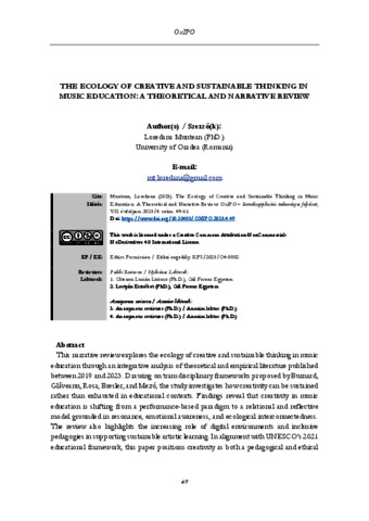 This narrative review explores the ecology of creative and sustainable thinking in music education through an integrative analysis of theoretical and empirical literature published between 2019 and 2025. Drawing on transdisciplinary frameworks proposed by Burnard, Glăveanu, Rosa, Bresler, and Mező, the study investigates how creativity can be sustained rather than exhausted in educational contexts. Findings reveal that creativity in musiceducation is shifting from a performance-based paradigm to a relational and reflective model grounded in resonance, emotional awareness, and ecological interconnectedness. The review also highlights the increasing role of digital environments and inclusivepedagogies in supporting sustainable artistic learning. In alignment with UNESCO’s 2021 educational framework, this paper positions creativity as both a pedagogical and ethical responsibility - an ongoing rhythm that connects knowledge, emotion, and culture in adynamic process of renewal. | A tanulmány a kreatív és fenntartható gondolkodás összefüggésrendszerét vizsgálja a zenei nevelésben, a 2019 és 2025 között megjelent elméleti és empirikus szakirodalom narratív elemzése alapján. Burnard, Glăveanu, Rosa, Bresler és Mező transzdiszciplináris megközelítéseire építve a kutatás azt tárja fel, miként tartható fenn - és nem kimeríthető - a kreativitás az oktatási folyamatokban. Az eredmények azt mutatják, hogy a zenei nevelésben a kreativitás a teljesítményközpontú paradigmáról egyre inkább egy relációs és reflektív modell felé mozdul el, amelyet a rezonancia, az érzelmi tudatosság és a kapcsolatrendszerek dinamikája jellemez. A tanulmány kiemeli a digitális tanulási környezetek és az inkluzív pedagógiai megközelítések növekvő szerepét a fenntartható művészeti tanulás támogatásában. Az UNESCO 2021-as oktatási keretrendszerével összhangban a kutatás a kreativitást pedagógiai és etikai felelősségként értelmezi - mint egy folyamatos ritmust, amely az ismeretet, az érzelmet és a kultúrát dinamikus megújulásban kapcsolja össze.