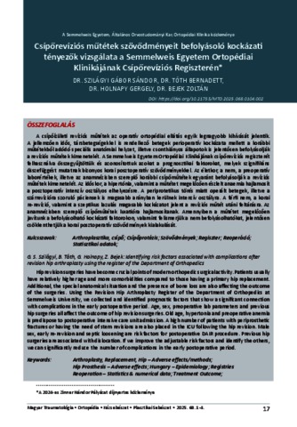 Szilágyi, Gábor Sándor and Tóth, Bernadett and Holnapy, Gergely and Bejek, Zoltán (2025) Csípőrevíziós műtétek szövődményeit befolyásoló kockázati tényezők vizsgálata a Semmelweis Egyetem Ortopédiai Klinikájának Csípőrevíziós Regiszterén. MAGYAR TRAUMATOLÓGIA ORTOPÉDIA KÉZSEBÉSZET PLASZTIKAI SEBÉSZET, 68 (1-4). pp. 17-27. ISSN 1217-3231
