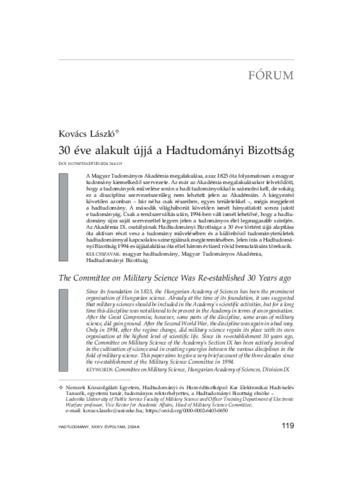 A Magyar Tudományos Akadémia megalakulása, azaz 1825 óta folyamatosan a magyar tudomány kiemelkedő szervezete. Az már az Akadémia megalakulásakor felvetődött, hogy a tudományok művelése során a hadi tudományokkal is számolni kell, de sokáig ez a diszciplína szervezetszerűleg nem lehetett jelen az Akadémián. A kiegyezést követően azonban – bár néha csak részeiben, egyes területekkel –, mégis megjelent a hadtudomány. A második világháborút követően ismét hányattatott sorsra jutott e tudományág. Csak a rendszerváltás után, 1994-ben vált ismét lehetővé, hogy a hadtudomány újra saját szervezettel legyen jelen a tudományos élet legmagasabb szintjén. Az Akadémia IX. osztályának Hadtudományi Bizottsága a 30 éve történt újjá alapítása óta aktívan részt vesz a tudomány művelésében és a különböző tudományterületek hadtudománnyal kapcsolatos szinergiáinak megteremtésében. Jelen írás a Hadtudományi Bizottság 1994-es újjáalakítása óta eltel három évtized rövid bemutatására törekszik. = Since its foundation in 1825, the Hungarian Academy of Sciences has been the prominentorganisation of Hungarian science. Already at the time of its foundation, it was suggestedthat military sciences should be included in the Academy’s scientific activities, but for a longtime this discipline was not allowed to be present in the Academy in terms of an organisation.After the Great Compromise, however, some parts of the discipline, some areas of militaryscience, did gain ground. After the Second World War, the discipline was again in a bad way.Only in 1994, after the regime change, did military science regain its place with its ownorganisation at the highest level of scientific life. Since its re-establishment 30 years ago,the Committee on Military Science of the Academy’s Section IX has been actively involvedin the cultivation of science and in creating synergies between the various disciplines in thefield of military science. This paper aims to give a very brief account of the three decades sincethe re-establishment of the Military Science Committee in 1994.