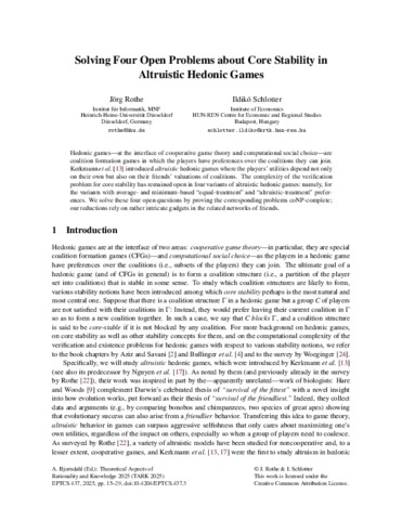 Rothe, J and Schlotter, Ildikó Anna (2025) Solving Four Open Problems about Core Stability in Altruistic Hedonic Games. ELECTRONIC PROCEEDINGS IN THEORETICAL COMPUTER SCIENCE, 437. pp. 15-29. ISSN 2075-2180