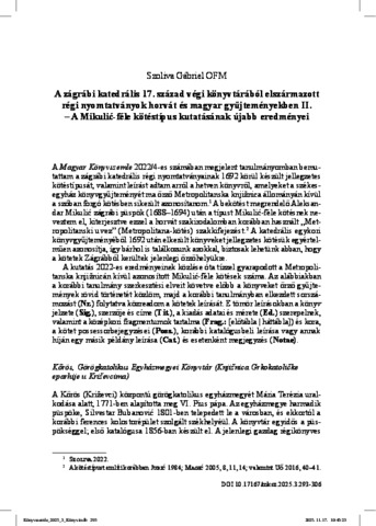 Szoliva, Gábriel (2025) A zágrábi katedrális 17. század végi könyvtárából elszármazott régi nyomtatványok horvát és magyar gyűjteményekben II. – A Mikulić-féle kötéstípus kutatásának újabb eredményei. MAGYAR KÖNYVSZEMLE, 141 (3). pp. 293-306. ISSN 0025-0171