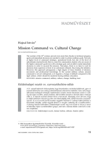 A 21. századi hadviselés bebizonyította, hogy köszönhetően a technikai fejlődésnek, gyors és azonnali döntésekre van szükség a kitűzött katonai célok elérése érdekében. Nem csak a magasabb parancsnokságok (stratégiai, hadműveleti) szintjén, hanem harcászati szinten is szükség van olyan vezetőkre, parancsnokokra, akik tisztában vannak az elérendő, akár a stratégia céllal is, és képesek azonnali döntést hozni a harcmezőn. Manapság nincs idő arra, hogy az elöljáró döntésére várjunk egy előre nem látott akadály előtt, ezáltal elveszítve a kezdeményezést. Ez az új vezetési forma azonban nagyfokú bizalmat és szakmai tudást feltételez a beosztottak irányába, ezáltal nagyobb döntési és mozgási szabadság áll a rendelkezésükre. A jelenlegi katonai kultúrában a küldetésalapú vezetés még nem terjedt el, hiszen a merev struktúrához képest szemléletváltást igényel, amit már a katonai oktatás során kell és érdemes elsajátítani. | The warfare of the 21stcentury proved even more that, thanks to technical progress,quick and immediate decisions are needed in order to achieve military goals. Not onlyat higher level of command (strategic, operational level), but also at the level ofsubordinates (tactical level), there is a need for commanders, leaders who are aware ofthe higher command’s goal even with a strategic goal, and are able to make immediatedecisions in order to succeed the mission. Nowadays, there is no time to wait fordecisions from superiors in front of an unforeseen obstacle, thus losing the initiative.However, this approach presupposes a high degree of trust, freedom of decision,movement and professional knowledge. In the current military culture, missioncommand is not yet widespread, as it requires a change of attitude compared to therigid culture, which should be mastered during military education.