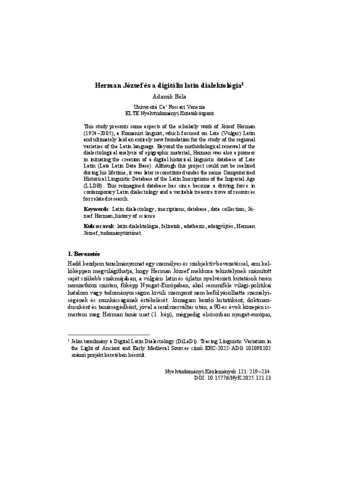| Uncontrolled Keywords: | Latin dialectology, inscriptions, database, data collection, József Herman, history of science, latin dialektológia, feliratok, adatbázis, adatgyűjtés, Herman József, tudománytörténet |