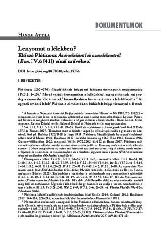 Hangai, Attila (2024) Lenyomat a lélekben? Előszó Plótinosz Az érzékelésről és az emlékezetről (Enn. IV.6 [41]) című művéhez. MAGYAR FILOZÓFIAI SZEMLE, 68 (3). pp. 245-277. ISSN 0025-0090 (print); 1588-1024 (online)