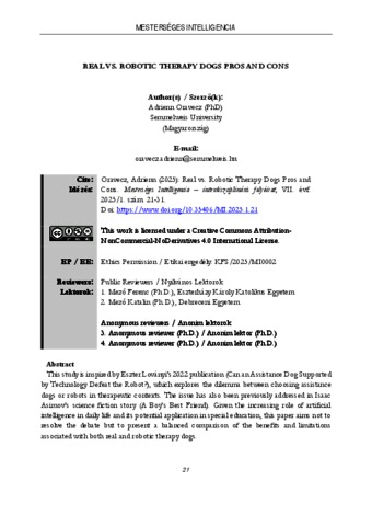 This study is inspired by Eszter Loványi’s 2022 publication (Can an Assistance Dog Supportedby Technology Defeat the Robot?), which explores the dilemma between choosing assistancedogs or robots in therapeutic contexts. The issue has also been previously addressed in IsaacAsimov’s science fiction story (A Boy’s Best Friend). Given the increasing role of artificialintelligence in daily life and its potential application in special education, this paper aims not toresolve the debate but to present a balanced comparison of the benefits and limitationsassociated with both real and robotic therapy dogs. | A tanulmány megírását Loványi Eszter „Legyőzheti-e technológiával támogatott segítőkutya a robotot? Kísérlet a „segítőkutya vagy segítőrobot” típusú dilemmák feloldására” című 2022- es tanulmánya inspirálta. Ezt az érdekes kérdést tárja az olvasó elé Isaac Asimov 1975- ös regénye is „Egy fiú legjobb barátja” címmel. Az tény, hogy a mesterséges intelligencia egyre nagyobb teret hódít a mindennapi életünkben, így a gyógypedagógiában is lehet létjogosultsága. Jelen tanulmány szerzője nem kíván állást foglalni egyik oldalon sem, inkább csak arra vállalkozik, hogy ismertese a hagyományos, valamint a robot kutyákkal végzett gyógypedagógiai segítségnyújtás előnyeit és hátrányait.