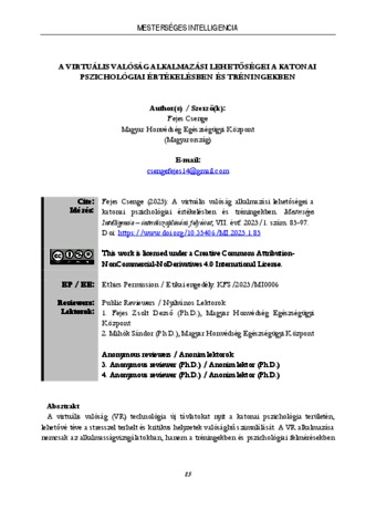 A virtuális valóság (VR) technológia új távlatokat nyit a katonai pszichológia területén,lehetővé téve a stresszel terhelt és kritikus helyzetek valósághű szimulálását. A VR alkalmazásanemcsak az alkalmasságvizsgálatokban, hanem a tréningekben és pszichológiai felmérésekben is egyre fontosabb szerepet játszik, segítve a helyzetfelismerés, döntéshozatal és csapatmunkamérését. A szimulált környezetek dinamikusan alkalmazkodhatnak a különböző igényekhez,miközben a fiziológiai reakciók, mint a pulzusszám, vérnyomás, légzésszám, vagy bizonyoshormonok szintjének változása is figyelemmel kísérhetők egyéb, ezek detektálására alkalmaskiegészítő eszközökkel. Jelen tanulmány célja a VR-technológia potenciáljának feltérképezése akatonai pszichológia széles spektrumában, kiemelve annak szerepét a pszichológiai alkalmasságértékelésében, a kiképzésben és a stresszkezelés hatékonyságának fejlesztésében. | Virtual reality (VR) technology opens new horizons in the field of military psychology by enabling the realistic simulations of stress-inducing and high-risk situations. The application of VR is becoming increasingly significant not only in psychological assessments but also in training and psychological evaluation processes, supporting the measurment of situational awareness, decision-making, and teamwork. Simulated environments can dynamically adapt to varying demands, while psychological responses (e.g. heart rate, hormonal changes) can be monitored through additional integrated tools. This study aims to explore the potential of VR technology across the broad spectrum of military psychology, with particular emphasis on its role in psychological aptitude evaluation, training, and the development of stress management capabilities.