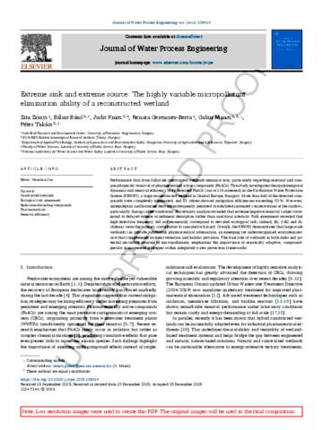 Zrinyi, Zita and Bánó, Bálint and Knisz, Judit and Gerencser-Berta, Renata and Maasz, Gabor and Takács, Péter (2026) Extreme sink and extreme source: The highly variable micropollutant elimination ability of a reconstructed wetland. JOURNAL OF WATER PROCESS ENGINEERING, 02 (82). ISSN 2214-7144 (In Press)