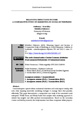 Sultanova, Malokhat (2025) Balancing impact and income: A comparative study of marketing in social enterprises = Hatás és jövedelem egyensúlya: a marketing szerepének összehasonlító vizsgálata a társadalmi vállalkozásokban. LÉLEKTAN ÉS HADVISELÉS, 7 (1). pp. 37-61. ISSN 2676-9964