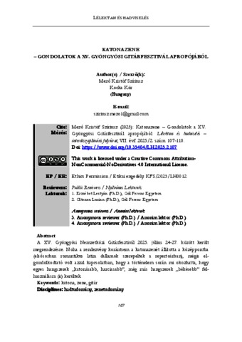 Mező, Kristóf Szíriusz (2025) Katonazene : Gondolatok a XV. Gyöngyösi Gitárfesztivál apropójából = Military music : thoughts on the occasion of the 15th Gyöngyös Guitar Festival. LÉLEKTAN ÉS HADVISELÉS, 7 (2). pp. 107-110. ISSN 2676-9964