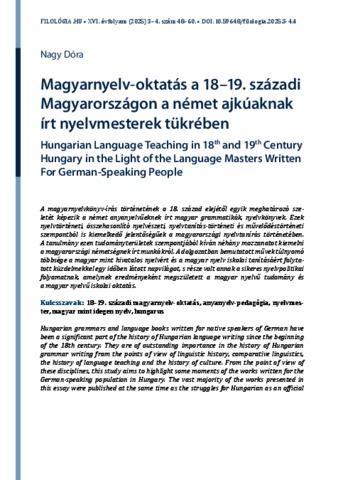 Nagy, Dóra (2025) Magyarnyelv-oktatás a 18-19. századi Magyarországon a német ajkúaknak írt nyelvmesterek tükrében = Hungarian Language Teaching in 18th and 19th Century Hungary in the Light of the Language Masters Written For German-Speaking People. FILOLÓGIA.HU, 16 (3-4). pp. 48-60. ISSN 2062-7858
